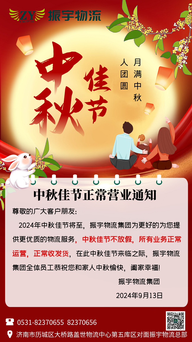 2024年中秋佳節(jié)將至,振宇物流集團(tuán)為更好的為您提供更優(yōu)質(zhì)的物流服務(wù),中秋佳節(jié)不放假,所有業(yè)務(wù)正常運(yùn)營,正常收發(fā)貨,在此中秋佳節(jié)來臨之際,振宇物流集團(tuán)全體員工恭祝您和家人中秋愉快,闔家幸福!