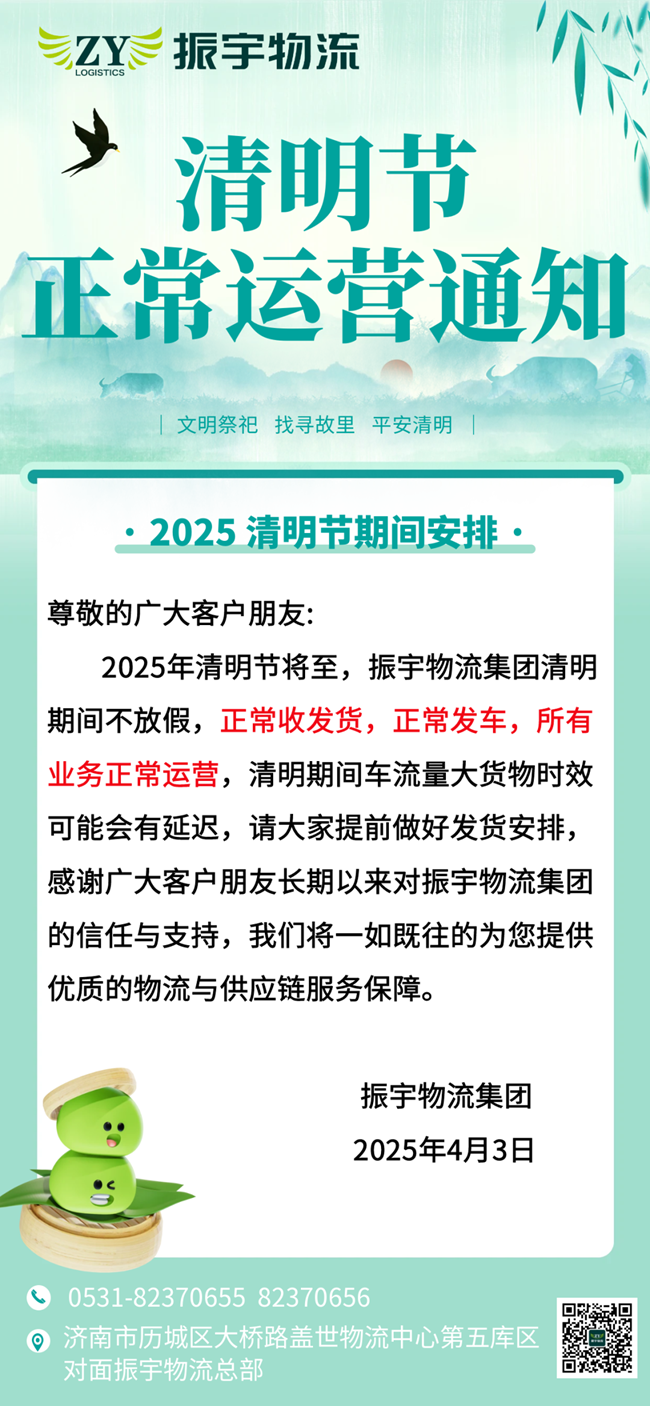 2025年清明節(jié)將至,振宇物流集團清明期間不放假,正常收發(fā)貨,正常發(fā)車,所有業(yè)務(wù)正常運營,清明期間車流量大貨物時效可能會有延遲,請大家提前做好發(fā)貨安排,感謝廣大客戶朋友長期以來對振宇物流集團的信任與支持,我們將一如既往的為您提供優(yōu)質(zhì)的物流與供應(yīng)鏈服務(wù)保障。