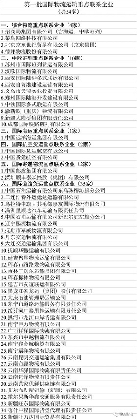 按照運(yùn)力資源充足、網(wǎng)絡(luò)覆蓋健全、運(yùn)輸組織高效、經(jīng)營(yíng)信譽(yù)良好的原則,經(jīng)各有關(guān)部門及沿邊省份交通運(yùn)輸主管部門推薦,確定54家企業(yè)作為第一批國(guó)際物流運(yùn)輸重點(diǎn)聯(lián)系企業(yè),其中,綜合物流企業(yè)4家、中歐班列運(yùn)營(yíng)企業(yè)10家、國(guó)際航運(yùn)企業(yè)1家、國(guó)際航空貨運(yùn)企業(yè)2家、國(guó)際寄遞物流企業(yè)2家、國(guó)際道路運(yùn)輸企業(yè)35家。包括招商局集團(tuán)、菜鳥網(wǎng)絡(luò)、京東集團(tuán)、德邦股份、中遠(yuǎn)海運(yùn)、中國(guó)郵政集團(tuán)、順豐、國(guó)貨航等企業(yè)入圍。