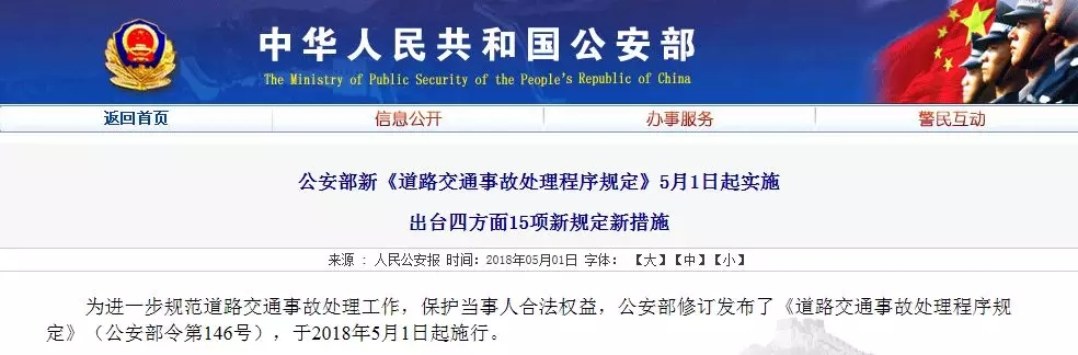 為進(jìn)一步規(guī)范道路交通事故處理工作,保護(hù)當(dāng)事人合法權(quán)益,日前,公安部修訂發(fā)布了《道路交通事故處理程序規(guī)定》(公安部令第146號(hào)),該規(guī)定已于2018年5月1日起正式施行。