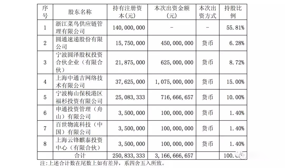 公告顯示,2018年第一季度,浙江驛??傎Y產(chǎn)6922萬(wàn)元,總負(fù)債7257.9萬(wàn)元,凈資產(chǎn)-335.9萬(wàn)元,營(yíng)業(yè)收入483.3萬(wàn)元,凈利潤(rùn)-1.14億元。本次增資前,浙江驛棧由浙江菜鳥供應(yīng)鏈100%控股,本次增資后浙江驛棧的股本結(jié)構(gòu)如下: