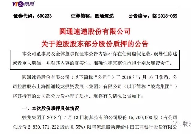 7月17日,圓通速遞發(fā)布關(guān)于控股股東部分股份質(zhì)押的公告。公告顯示,公司控股股東上海圓通蛟龍投資發(fā)展(集團(tuán))有限公司(以下簡稱“蛟龍集團(tuán)”)將其持有的公司部分股份辦理了質(zhì)押。