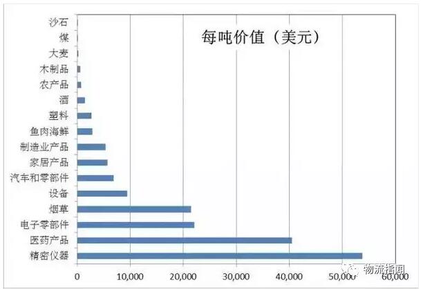 其次是經(jīng)濟(jì)水平?jīng)Q定的貨物價值。同樣一公斤貨,因為單公斤貨物價值的不同會對GDP產(chǎn)生很大影響。例如下圖是美國不同類別的貨物平均每噸的價值,可以看到差別非常大,一噸煤和一噸煙草價值可以相差100倍。同樣一噸貨物,價值更高對應(yīng)的GDP就更高。